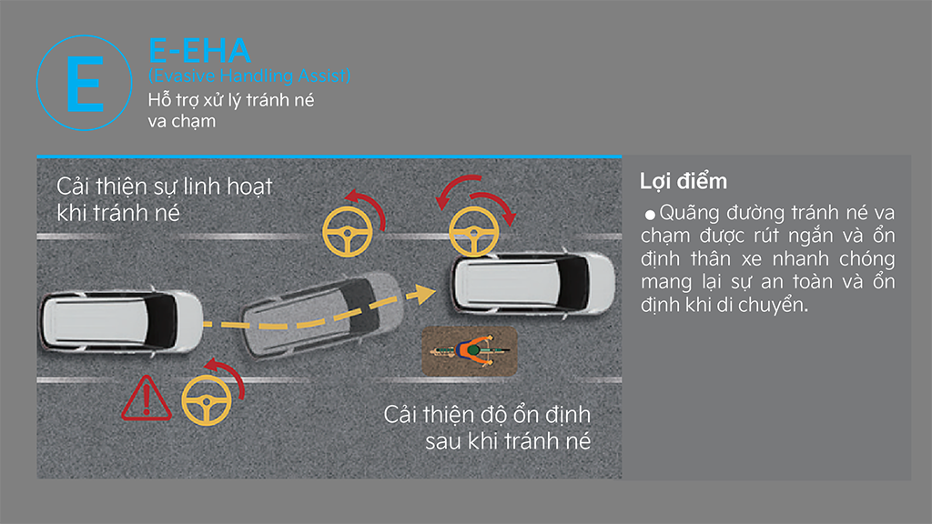 – Hỗ trợ xử lý tránh va chạm (E-EHA Evasive Handling Assist): tối ưu khả năng tránh va chạm trong tình huống đánh lái khẩn cấp và cải thiện ổn định thân xe sau khi tránh va chạm.